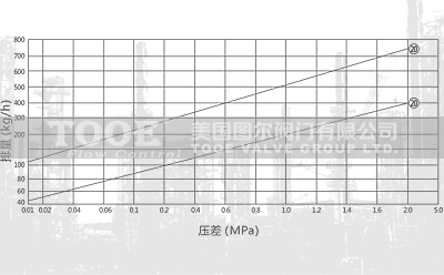 - 壓差是指疏水閥的入口端壓力與出口端壓力的壓力差,同一產品在不同壓差(橫軸)下,流量(縱軸)不同。