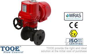 ①防爆型電動球閥流體阻力小,是所有閥類中流體阻力較小的一種,以AC220V、AC380V或DC24V電源電壓動作力,接受(4-20mA,0-10mA或1-5VDC)電流信號或電壓信號,即可控制運(yùn)轉(zhuǎn),以角行程輸出的扭矩轉(zhuǎn)動球體0-90°,就能完成啟閉動作或調(diào)節(jié)動作。